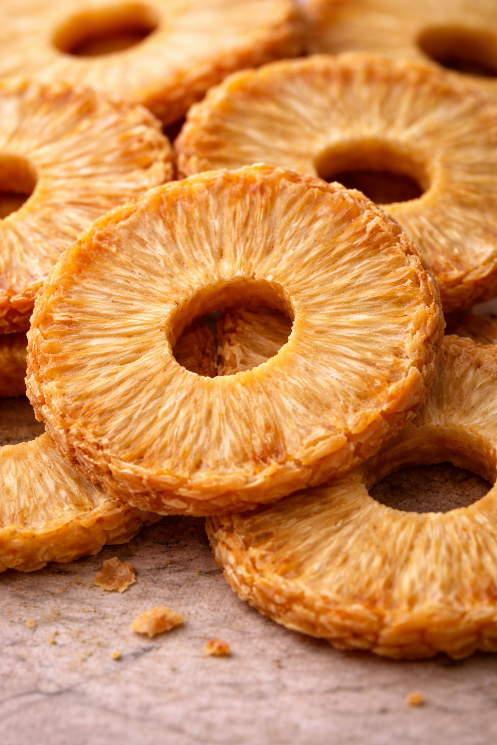 Getrocknete Premium-Ananasringe ohne Herzstück. Die Premium-Ringe sind besonders groß und gleichmäßig. Das goldgelbe Fruchtfleisch ist arteigen süß und schmeckt fruchtig sauer. Getrocknete Ananas ist ballaststoffreich. Sie schmeckt pur als Snack und in Mischungen.