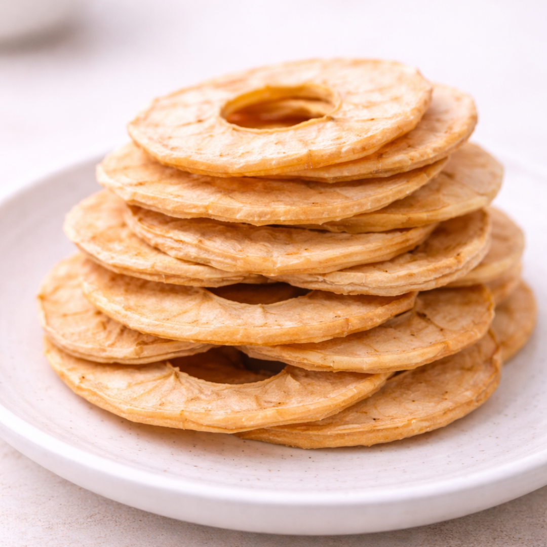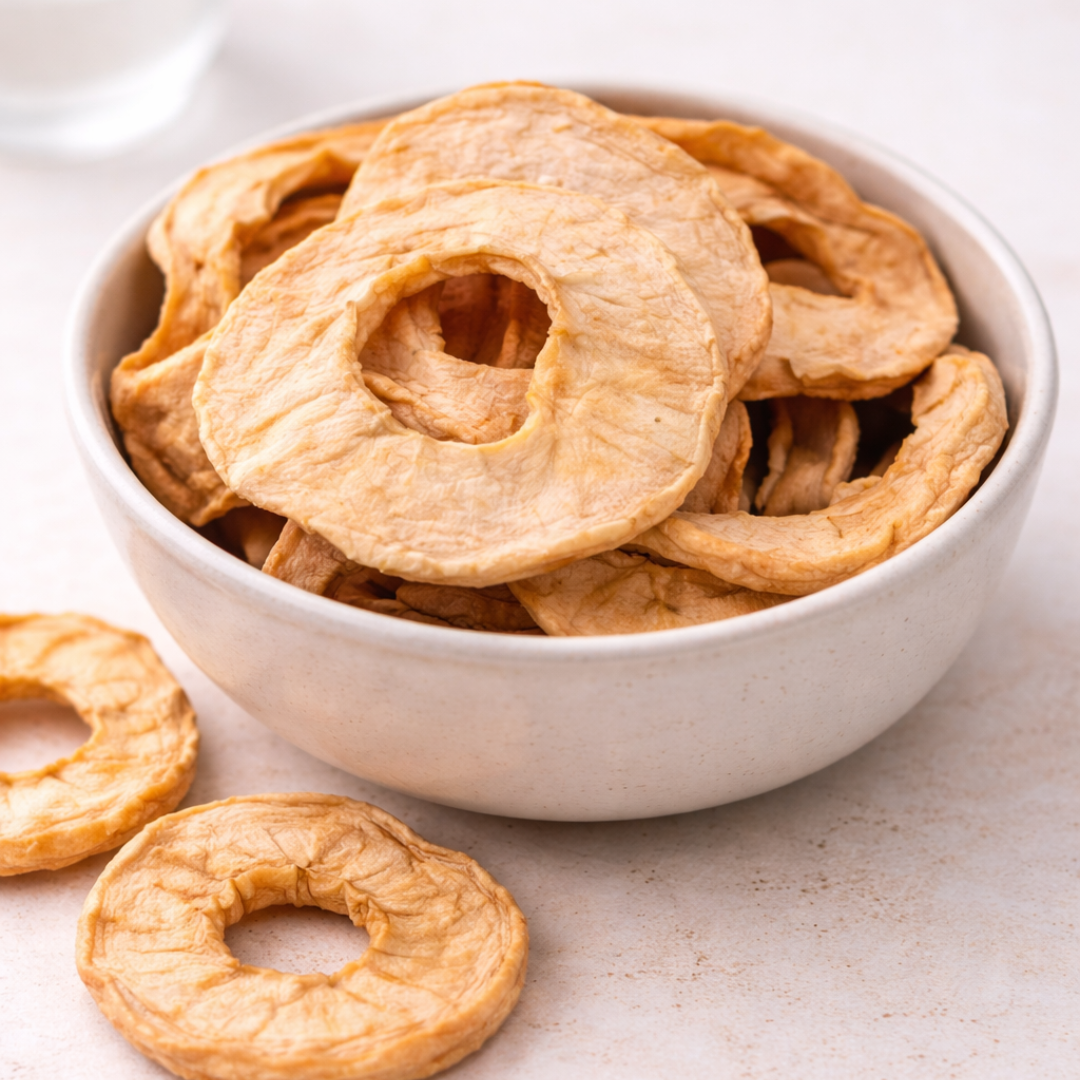 Weiche, getrocknete Apfelringe aus ökologischem Anbau. Die Ringe haben eine goldgelbe bis hellbraune Farbe. Ihr Geschmack ist arttypisch fruchtig und variiert je nach verwendeter Apfelsorte von eher süß bis süß-säuerlich. Die Apfelringe sind ein ballaststoffreicher, natürlicher Snack und damit eine ideale Nascherei für zwischendurch. Genießen Sie diese Leckerei pur, in Mischungen oder kleingeschnitten in Müsli, Porridge und als Zutat für Energieriegel und -bällchen. Auch als Zutat für Kuchen- und Muffinteige geeignet, am besten mit einer großzügigen Prise Ceylon-Zimt aromatisch abgerundet. Apfel-Zimt-Frühstücksgenuss lieber fertig gemischt? Hier klicken.