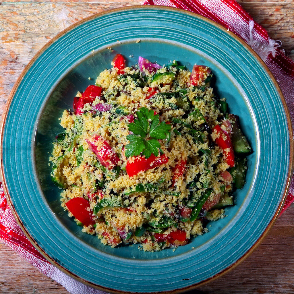 250ml Wasser erhitzen, zusammen mit 250g Couscous, 1/2 TL Salz und 1 TL Olivenöl in eine Schüssel geben und verrühren. Etwa 5 Min. quellen lassen, mit Kräutern würzen, warm oder kalt als Beilage oder Salatgrundlage servieren.