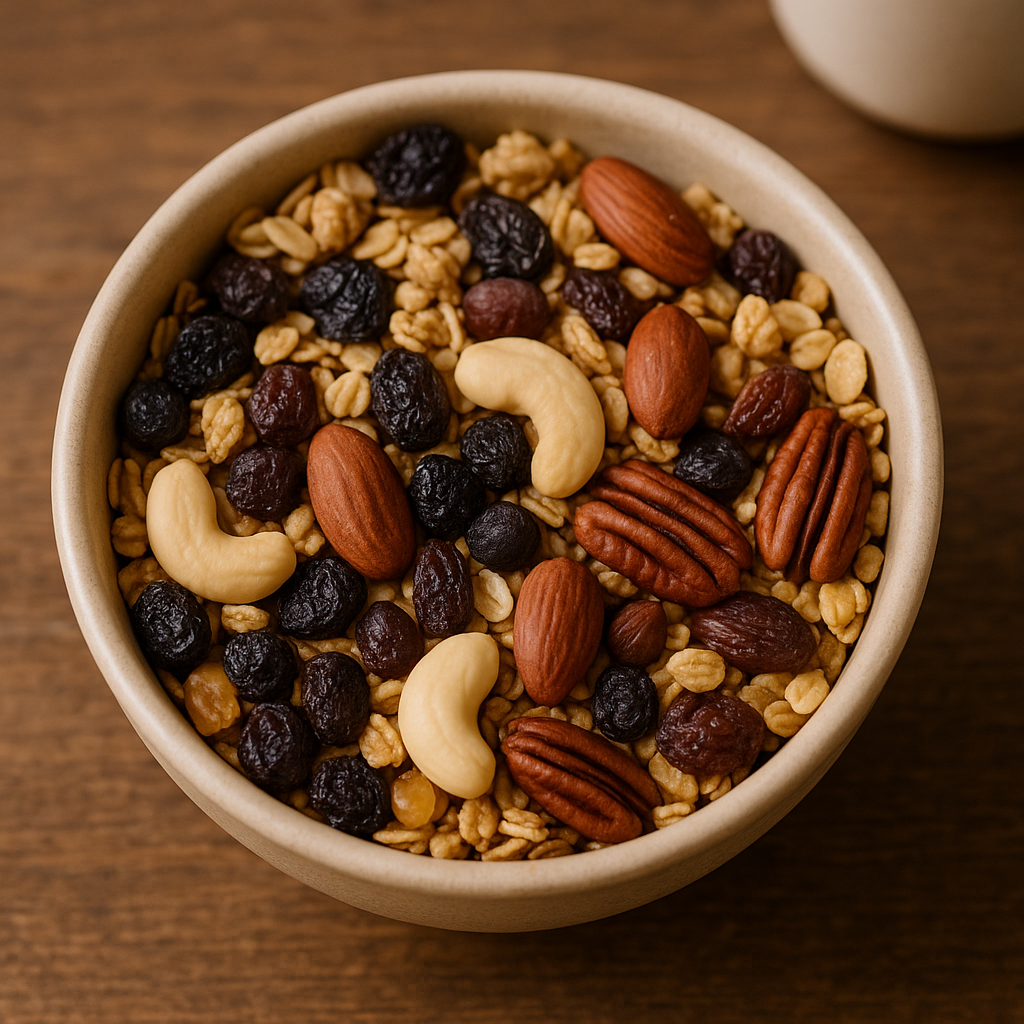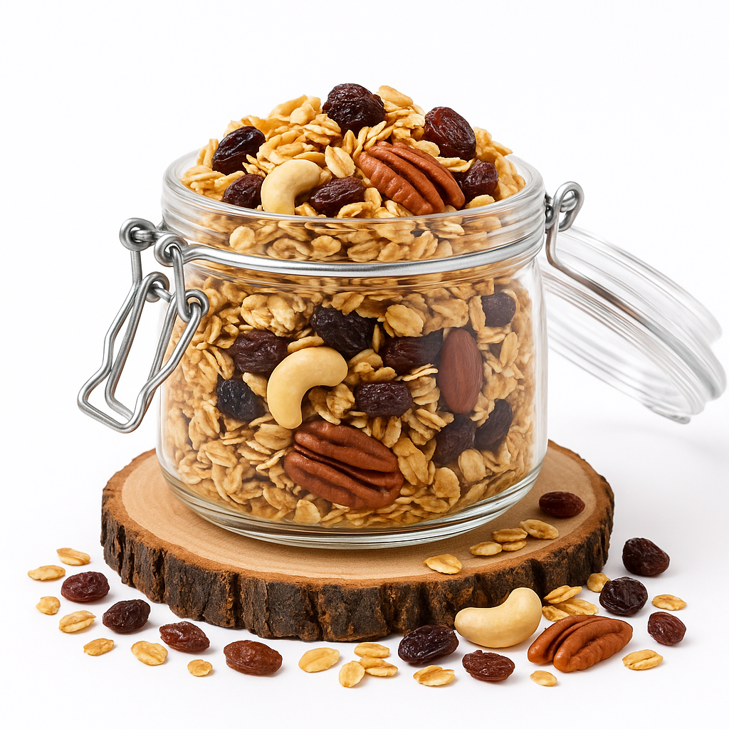 Crunchy* (Haferflocken* 65%, Rohrzucker*, Kokosfett*, Kokosraspel*, Reisextrudat* (Vollkornreismehl*), Meersalz), Weinbeeren* 11% (Weinbeeren* 99,5%, Sonnenblumenöl*), Cashewkerne* 7%, Mandeln braun* 7%, Sultaninen* 4% (Sultaninen* 99,5%, Sonnenblumenöl*), Pekannusskerne* 1%
