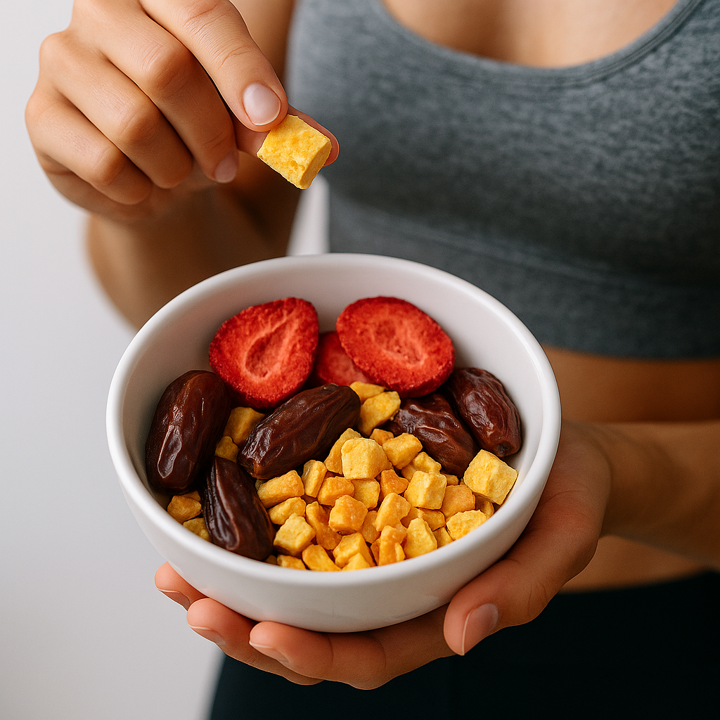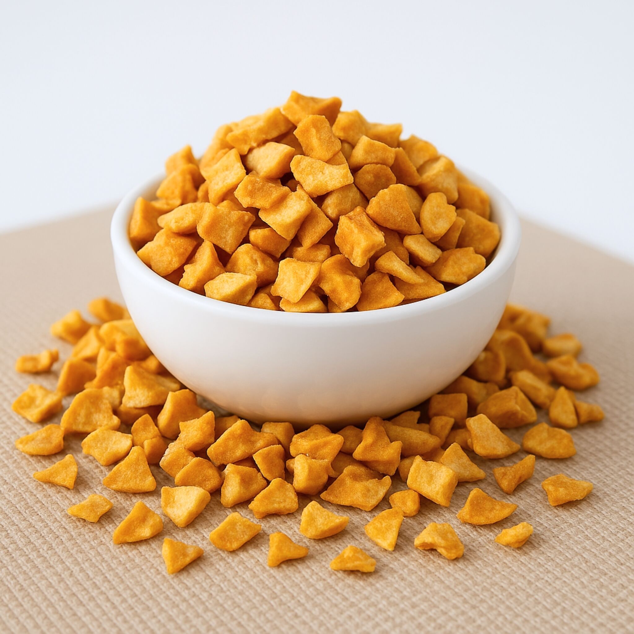 Unsere gefriergetrockneten Bio-Mangowürfel zeichnen sich durch ihr süßes, aromatisches Profil aus. Sie werden aus 100% vollreifen, frisch eingefrorenen Mangos hergestellt. Mit der schonenden Methode der Gefriertrocknung bleiben ihre natürlichen Eigenschaften wie Form, intensive Farbe und fruchttypischer Geruch und Geschmack erhalten. Die Würfel sind knackig und reich an Ballaststoffen, eine hervorragende Wahl für knusprige Frühstücksmischungen, innovative Dessertkreationen oder einfach als natursüßer Snack zwischendurch. So können Sie das exotische Aroma dieser beliebten Frucht das ganze Jahr über genießen. So schmecken die Tropen!
