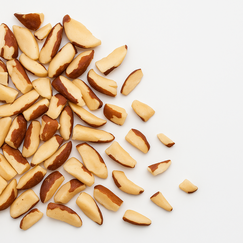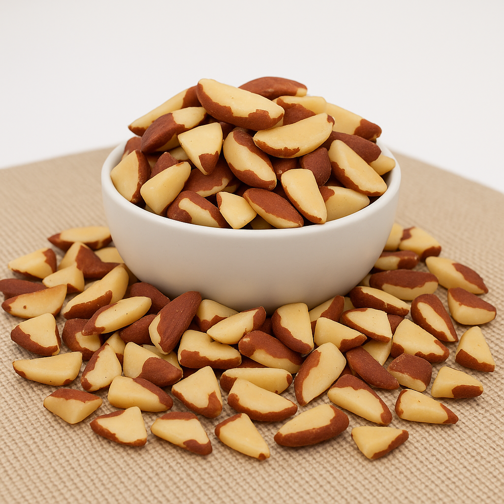 Paranusskernstücke in unterschiedlichen Größen. Die elfenbeinfarbenen Nusskerne mit braunen Hautanteilen haben eine knackige Konsistenz und schmecken mild-aromatisch. Paranusskerne haben einen hohen Gehalt an Ballaststoffen. Sie wachsen wild in den Regenwäldern des Amazonasgebietes und werden dort aufwendig gesammelt und nicht geerntet. Sie stammen aus Bolivien, Brasilien oder Peru. Lecker zum Knabbern oder für eigene Mischungen, fein gehackt eine fein nussige Zutat für Gebäck, Müsliriegel oder Energiekugeln.