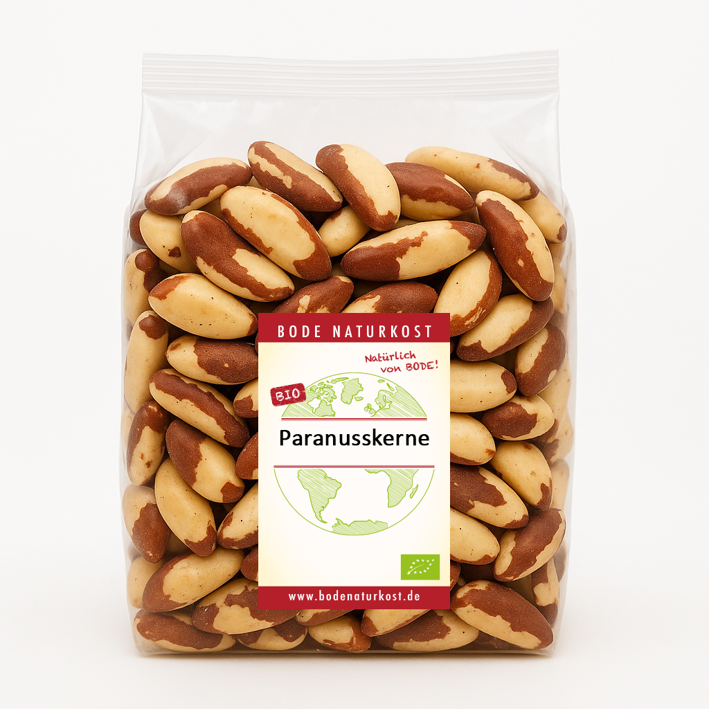 Die Nusskerne sind elfenbeinfarben mit braunen Hautanteilen. Sie haben eine knackige Konsistenz und schmecken mild-aromatisch, 500 g enthalten ca. 110 bis 180 Kerne. Paranusskerne haben einen hohen Gehalt an Ballaststoffen. Sie wachsen wild in den Regenwäldern des Amazonasgebietes und werden dort aufwendig gesammelt und nicht geerntet. Sie stammen aus Bolivien, Brasilien oder Peru.