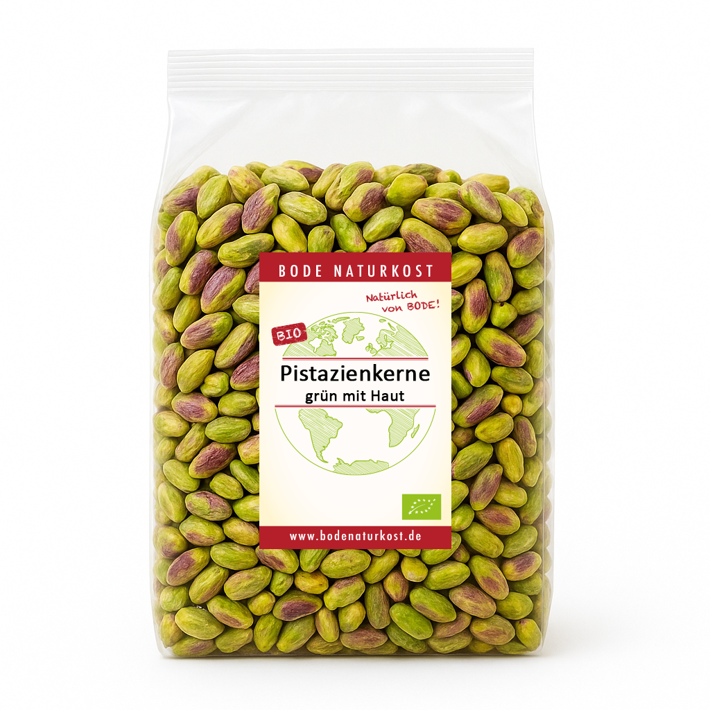 Grüne Bio Pistazienkerne mit Haut und ohne Schale. Das Innere der Pistazien ist gelb bis grün, die Haut grünbraun bis leicht violett. Ihr Geschmack ist leicht süßlich und intensiv nussig. Pistazien sind eine Eiweißquelle und reich an Ballaststoffen. Ihr einzigartiger Geschmack macht sie roh oder leicht geröstet zu einer hervorragenden Zutat oder Dekoration für köstliche Kuchen, Torten, Plätzchen und Desserts. Auch als Zutat in herzhaften Gerichten der orientalischen Küche sind sie eine wunderbare Bereicherung. Gönnen Sie sich diesen Luxus im Alltag und genießen Sie weitere leckeren Nüsse wie unsere gerösteten und gesalzenen Pistazienkerne mit Schale.