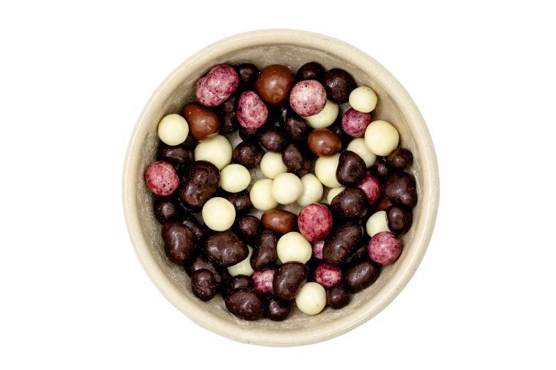 Gefriergetrocknete Erdbeerstücke, Blaubeeren und Himbeeren begeistern durch eine süße Kombination mit zarter Bio-Schokolade nach eigener Rezeptur. Die sommerliche Beeren-Mischung glänzt durch das Zusammenspiel mit Zartbitter-, Vollmilch-, sowie weißer-und lila-Schokolade.