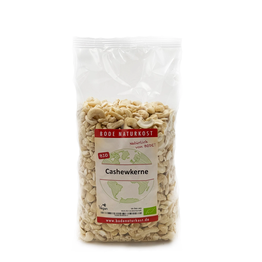 Organic cashew nuts with a mild, nutty flavour. Their size is determined by the number of kernels per English pound (454g). These kernels contain between 400 and 450 pieces. The kernels are ivory to beige in colour and a source of protein. Ideal for snacking: pure or in various mixtures, for cooking and baking, for exotic cuisine, as an ingredient for muesli, salads, sauces and desserts. Also perfect for making your own milk and cream alternatives, as well as for unbaked cakes, tarts and energy balls. Try our other cashew products in the shop, such as Vanilla Cashews and Cashew Butter. Processors will also find broken kernels in various sizes such as large and small cashew pieces for various applications.