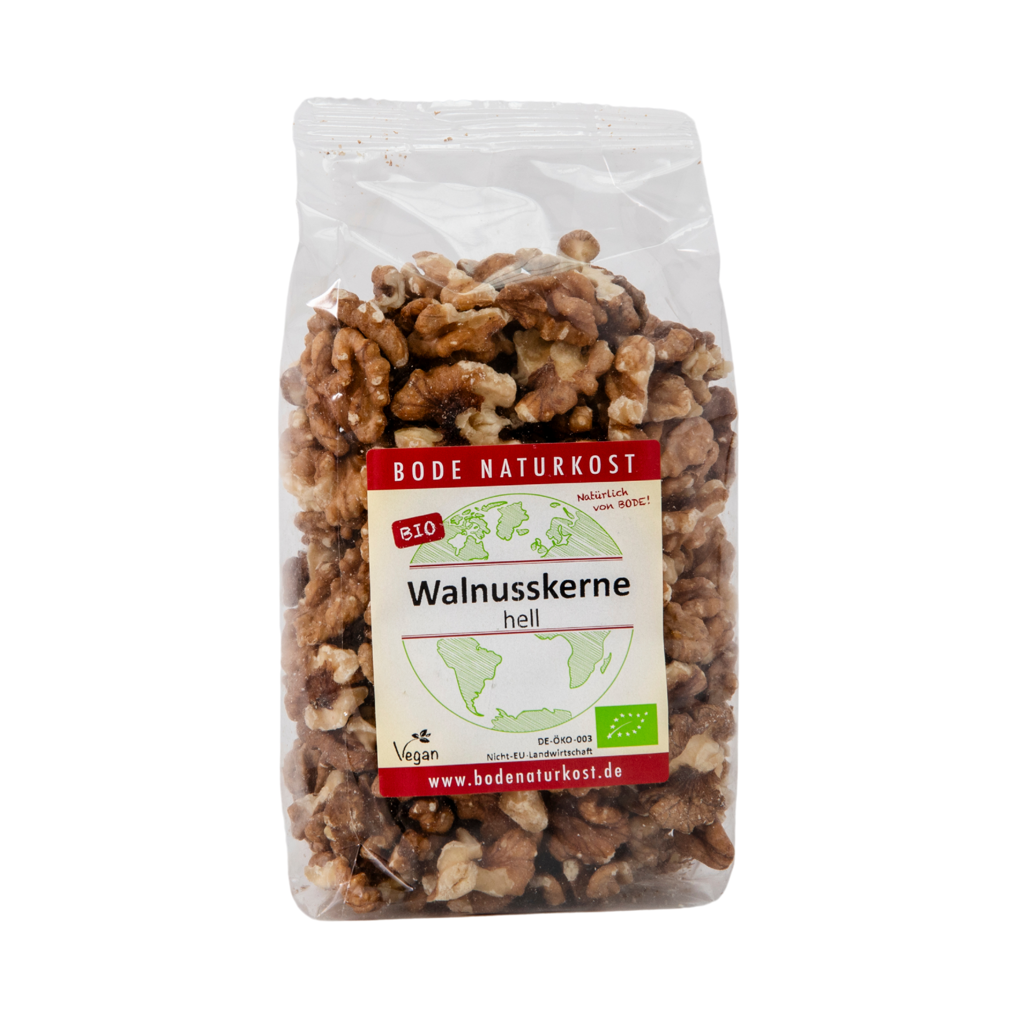 European walnut kernels are a flavourful global sensation! They have a mild, nutty taste that is delicately bitter and slightly sweet. These are predominantly light, halved kernels. The walnut halves are light brown, firm to the bite, and crunchy. They are rich in fibre. These kernels are perfect for baking and cooking, as an addition to salads and muesli, or as a garnish for pastries and desserts. They also make a satisfying, crunchy snack. Bio: Organic