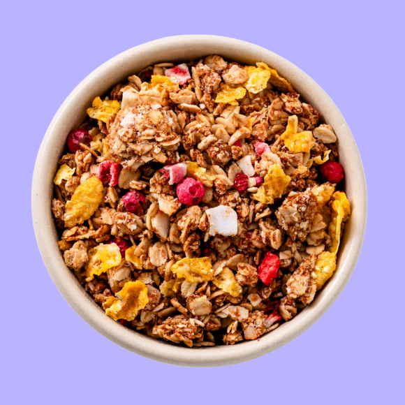 Crispy baked oat flakes with fruity and aromatic freeze-dried strawberry pieces create our summery Crunchy Strawberry. A delightful crunchy delight full of fibre with milk, yoghurt or a plant-based alternative, for breakfast, as a small snack or pure as a treat.