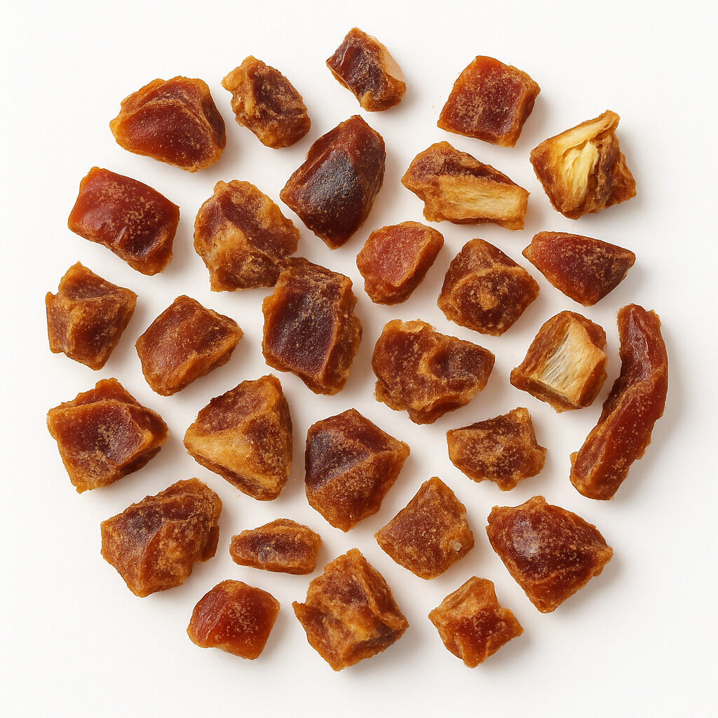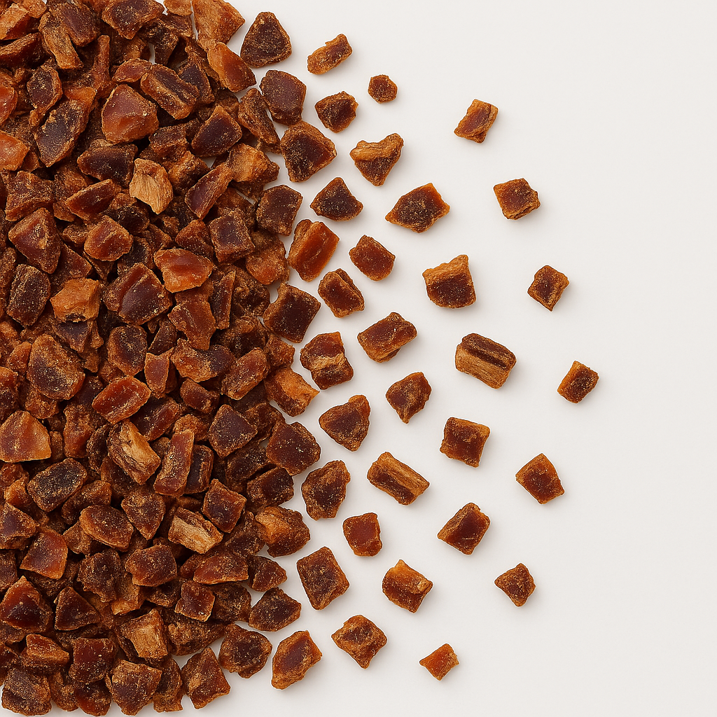 Dried diced dates coated with rice flour as a separating agent (<5%). The brown pieces are irregularly shaped and mainly 5 to 10 mm in size. These sweet cubes are a source of fibre, perfect for muesli and other mixes, as well as cooking and baking.