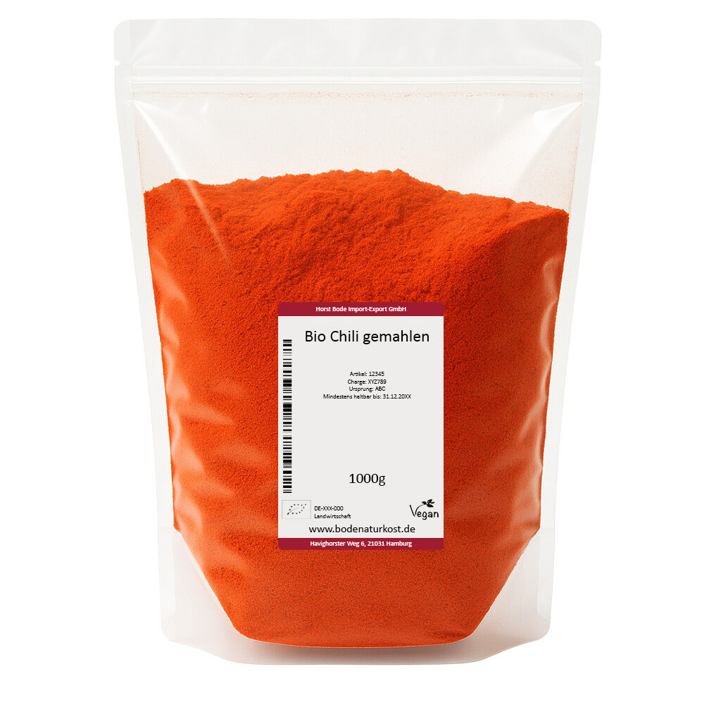 Dried and ground chili peppers. The reddish-brown powder has a medium-hot, slightly fruity taste and a fine texture. The production of our chili powder begins with the careful selection and harvesting of ripe red chili peppers. They are then gently dried to preserve their rich, spicy flavor and vibrant red color. Finally, the dried peppers are finely ground. Our ground chili can be used in a variety of dishes. It gives soups, stews, sauces, and marinades a spicy kick. It also enhances grilled dishes and gives Mexican or Indian dishes an authentic flavor. A pinch of chili powder also adds a surprising spice to your smoothies or chocolate desserts.