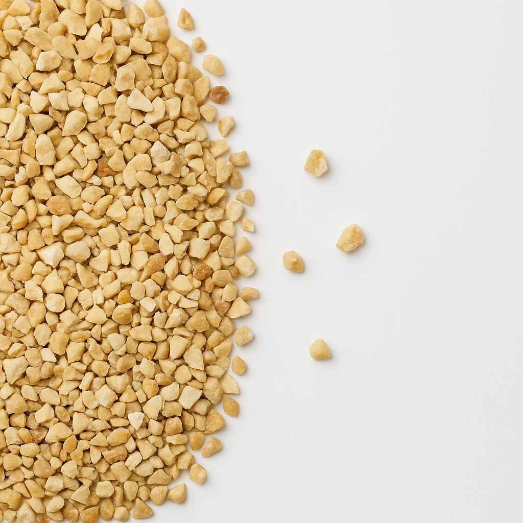 The cashew nut pieces are light and have colours ranging from white, light yellow, delicate ivory to light grey. They have a mild nutty taste, are predominantly 2.36 to 4.75 mm in size and include grades such as SSP (small scorched pieces), SWP (small white pieces) and SP1 (small pieces). They are a source of protein. Ideal for cooking and baking, exotic cuisine, as an ingredient for salads, sauces, desserts or student mix and for muesli. Deviations in size are possible, please ask your responsible salesperson about the currently available sizes and grades.