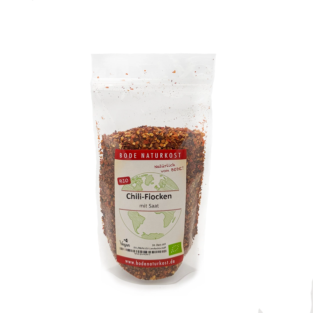 Add the right spice to your life! It's easy with our organic chilli flakes. They taste medium hot and slightly fruity and surprise with their red-yellow colour. Production begins with the careful selection and harvesting of ripe, red chilli peppers. They are then gently dried to preserve their rich, spicy flavour and bright red colour. Finally, the dried pods are crushed and carefully packaged. Our chilli can be used in a variety of dishes. It adds a spicy flavour to soups, stews, sauces and marinades. It also refines barbecue dishes and gives Mexican or Indian dishes an authentic flavour. A pinch of chilli also gives your smoothies a surprising spice and chocolate desserts a flavourful and visual kick.